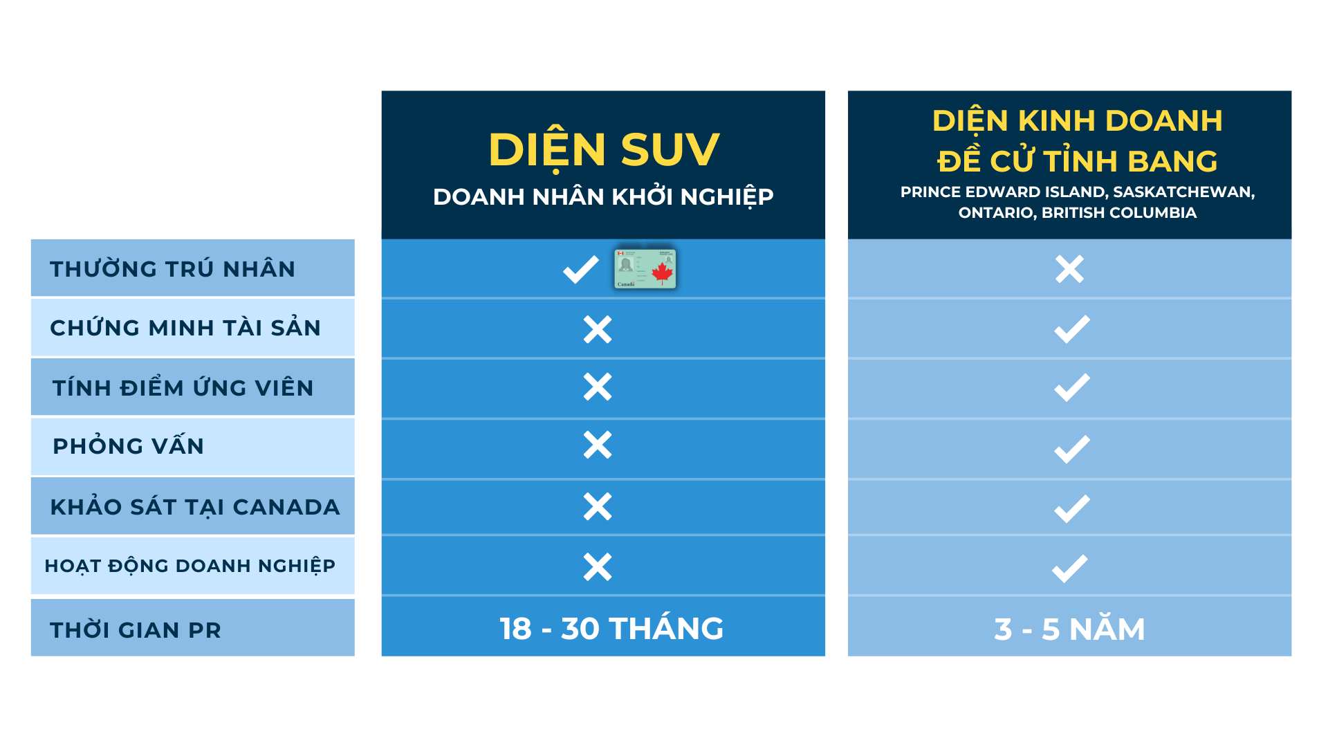 Chương trình Start Up Visa Canada (SUV), định cư doanh nhân tỉnh bang đã và đang trở thành điểm đến dành cho các doanh nhân sáng tạo tìm cách mở rộng kinh doanh tại Canada. Hiện nay, đang là một lựa chọn phổ biến nhất cho các doanh nhân trên toàn thế giới.
